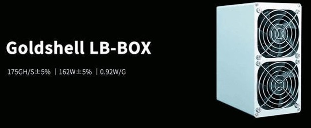 $Model LB-BOX from Goldshell mining Lbry algorithm with a maximum hashrate of 175Gh/s for a power consumption of 162W. Specifications Manufacturer Goldshell Model LB-BOX Also known as LB-BOX Release August 2021 Size 150 x 180 x 85mm Noise level 35db Fan(s) 2 Power 162W Interface Ethernet Temperature 5 - 45 °C Humidity 5 - 95 %